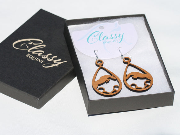 Abstract horse cherry hardwood laser cut earrings. They are unique and made in house here in Oregon. They will come in a gift box ready to gift to a friend or keep for yourself!