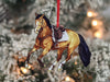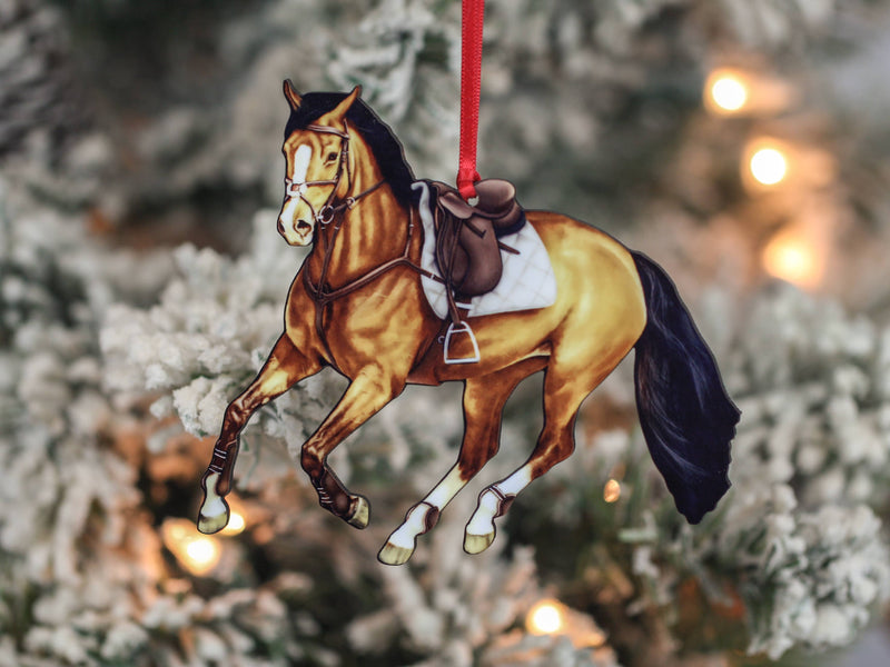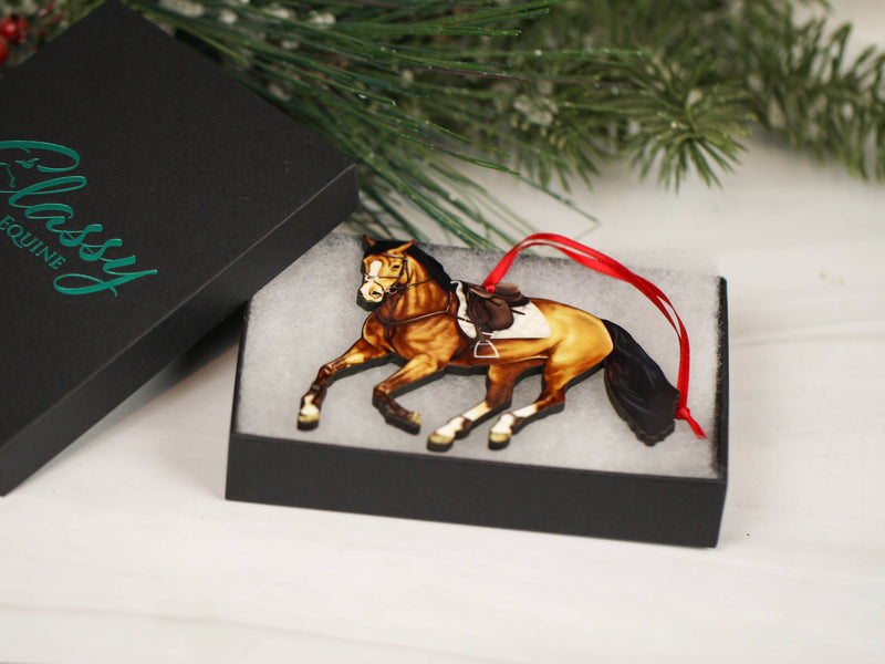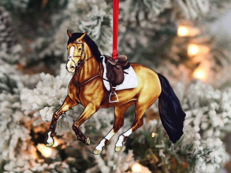 Here's a galloping buckskin jumper ready for the course. This jumping horse ornament comes with red and black ribbons for year around display beyond Christmas. This horse ornament is available in bay, chestnut, black, black and white tobiano, chestnut and white tobiano, dapple gray, buckskin and palomino.